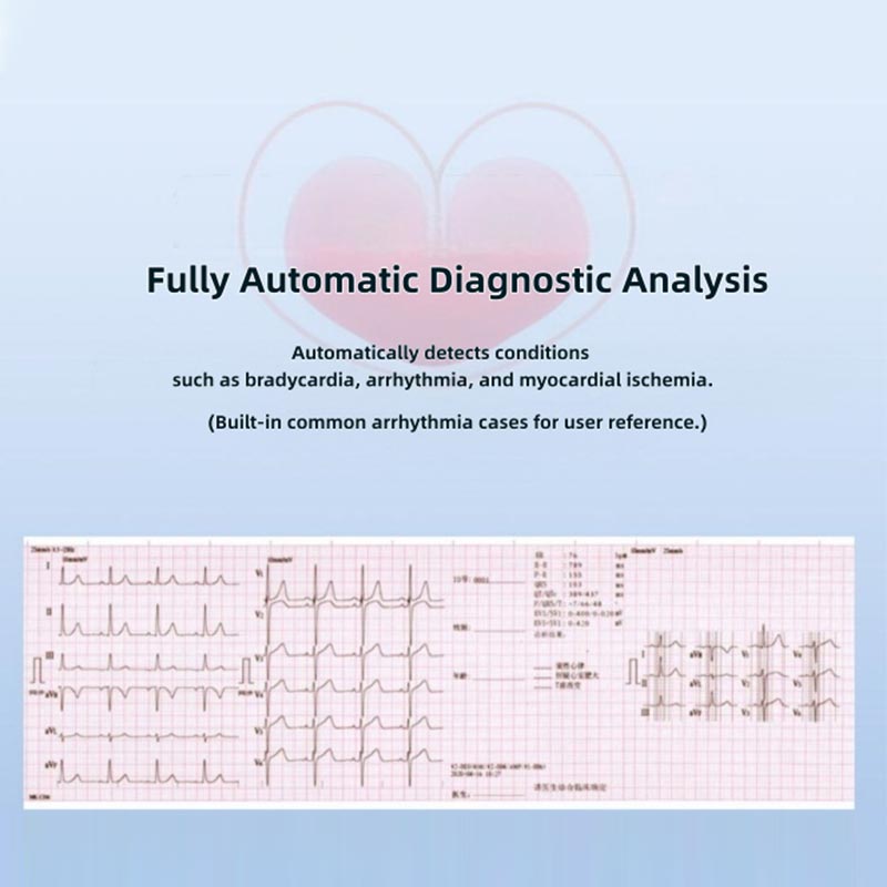 3. เครื่องตรวจคลื่นไฟฟ้าหัวใจ HTSY® ของเรามาพร้อมกับการวัดอัตราการเต้นของหัวใจอัตโนมัติและฟังก์ชันการวิเคราะห์อัจฉริยะ ทำให้เหมาะอย่างยิ่งสำหรับการวินิจฉัยทางคลินิกในแต่ละวัน ใช้คลื่นไฟฟ้าหัวใจที่ผ่านการทดสอบทางคลินิกอย่างมืออาชีพ อัลกอริธึมการวิเคราะห์ซึ่งสามารถจับการเปลี่ยนแปลงเล็กน้อยในสัญญาณไฟฟ้าของหัวใจได้อย่างแม่นยำโดยอัตโนมัติ ระบุสัญญาณไฟฟ้าหัวใจที่ผิดปกติต่างๆ ให้ผลการวัดอัตราการเต้นของหัวใจที่แม่นยำและรวดเร็ว รายงานการวิเคราะห์เบื้องต้นที่สมบูรณ์ ทำให้ไม่ต้องให้เจ้าหน้าที่ทางการแพทย์คำนวณและวิเคราะห์ด้วยตนเอง รูปคลื่น นอกจากนี้ เครื่องยังประกอบด้วยกรณีทั่วไปต่างๆ ของภาวะหัวใจเต้นผิดจังหวะทางคลินิกทั่วไปไว้ล่วงหน้าเพื่ออำนวยความสะดวก เจ้าหน้าที่ทางการแพทย์สามารถเข้าถึงและส่งต่อไปยังพวกเขาได้ตลอดเวลาระหว่างการวินิจฉัย ช่วยให้พวกเขาตัดสินใจได้แม่นยำยิ่งขึ้น สภาพของผู้ป่วย
