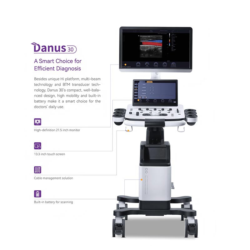 เครื่องอัลตราซาวนด์เป็นทางเลือกที่ชาญฉลาดสำหรับการวินิจฉัยที่มีประสิทธิภาพ นอกเหนือจากแพลตฟอร์ม Hi อันเป็นเอกลักษณ์ เทคโนโลยีมัลติบีม และ เทคโนโลยีทรานสดิวเซอร์ BTM การออกแบบที่กะทัดรัดและสมดุลของ Danus 30 ความคล่องตัวสูงและแบตเตอรี่ในตัว เป็นทางเลือกที่ชาญฉลาดสำหรับการใช้งานของแพทย์ทุกวัน