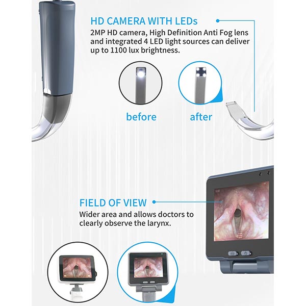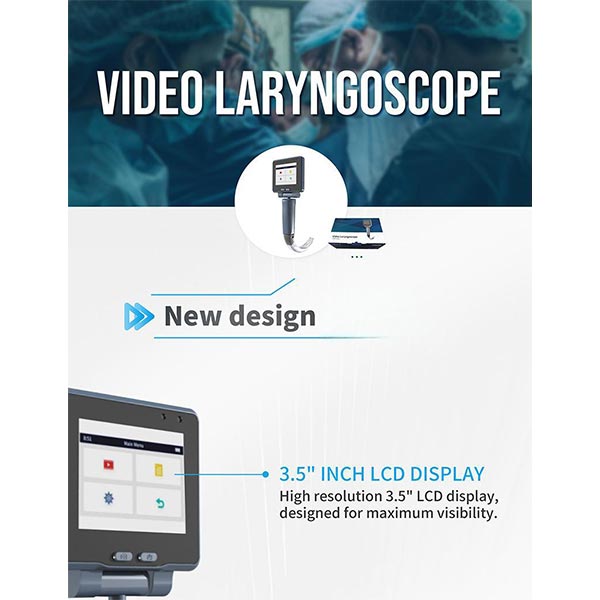 จอแสดงผล LCD ขนาด 1.3.5 นิ้ว: Video Laryngoscope มีจอ LCD ความละเอียดสูงขนาด 3.5 นิ้ว ดังนั้นภาพจึงชัดเจนเสมอและ มั่นคง ไม่ว่าคุณจะอยู่ในสภาพแวดล้อมทางคลินิกหรือการทำงานแบบใดก็ตาม ข้อมูลดังกล่าวจะช่วยให้คุณมีทัศนวิสัยที่ดีเยี่ยม ดังนั้นคุณจึงสามารถสังเกตได้ ได้อย่างแม่นยำและเชื่อถือได้ทุกครั้ง
